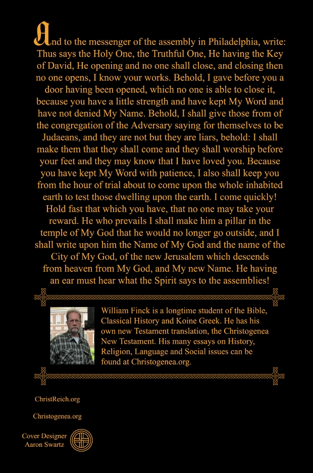 ChristReich is the home of William Finck's Commentary on the Revelation of Yahshua (Jesus) Christ, and a project of his popular website, Christogenea.org. It is also the name of his book, ChristReich: A Commentary on the Revelation of Yahshua Christ. The entire text of the book is available freely on this website here. The book itself is available at Christogenea. Click here for the Christogenea Books page.